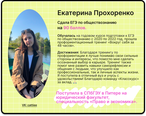 Выпускница РАНХиГС, факультет «Юриспруденция». Сдала ЕГЭ по обществознанию на 84 балла. В команде занимает должность методиста.